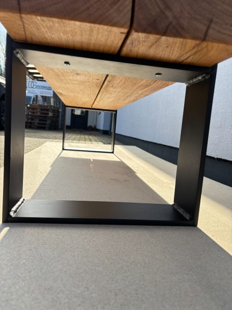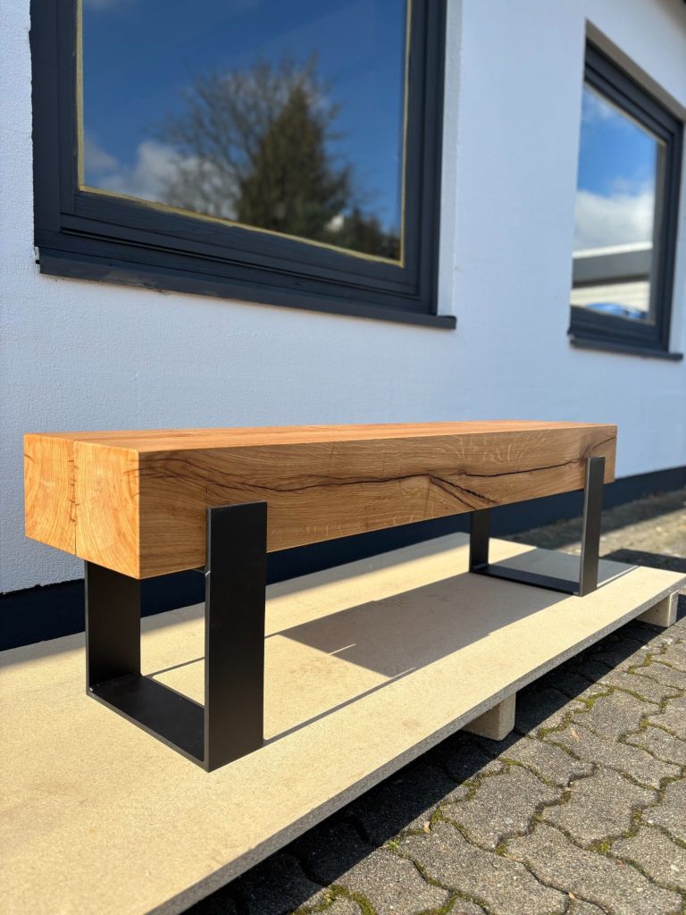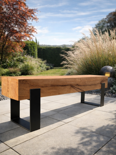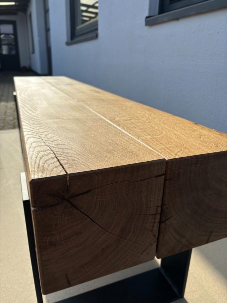 Handgefertigte, massive Eichenbalken 15 x 15 cm und farblos geölter Oberfläche. Die markante Maserung und natürlichen Risse unterstreichen den rustikalen Charme und machen dadurch jedes Stück zu einem echten Unikat!